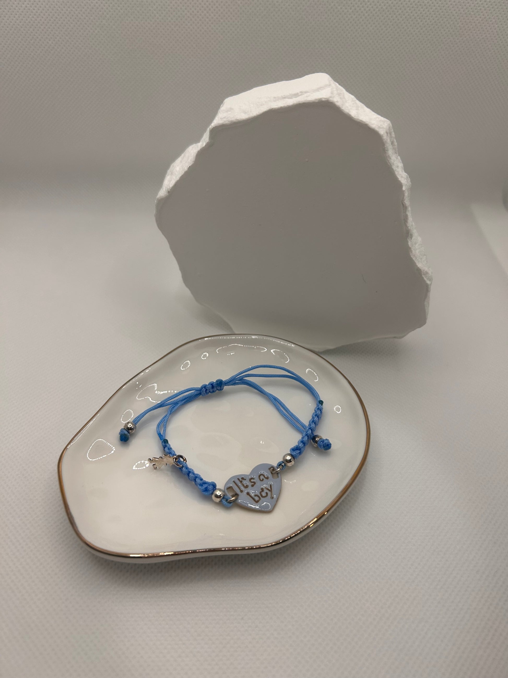 Celebrate the arrival of a precious little boy with this Italian-made bracelet, crafted in 925 sterling silver with a soft blue adjustable cord. Featuring a heart charm with “It’s a Boy” engraving, silver bead accents, and handmade macramé details, it’s the perfect keepsake or gift.